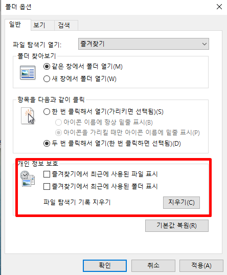 3. 개인정보 보호에 체크되어 있는것을 해제하고 기록 지우고 저장