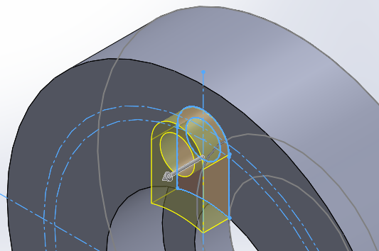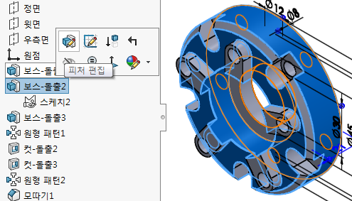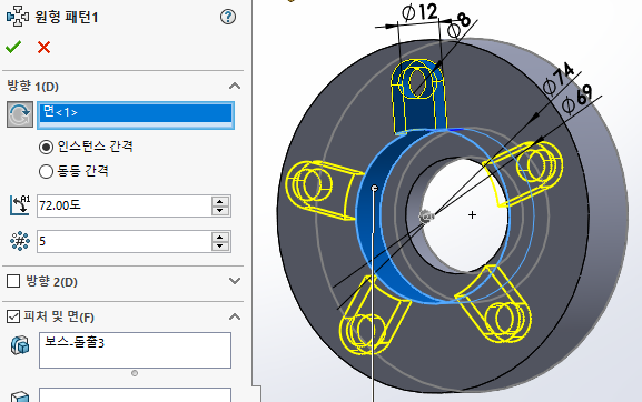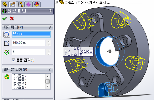 '돌출컷' 한 부분을 '원형패턴'을 주기 위해 패턴할 부분을 선택한다.