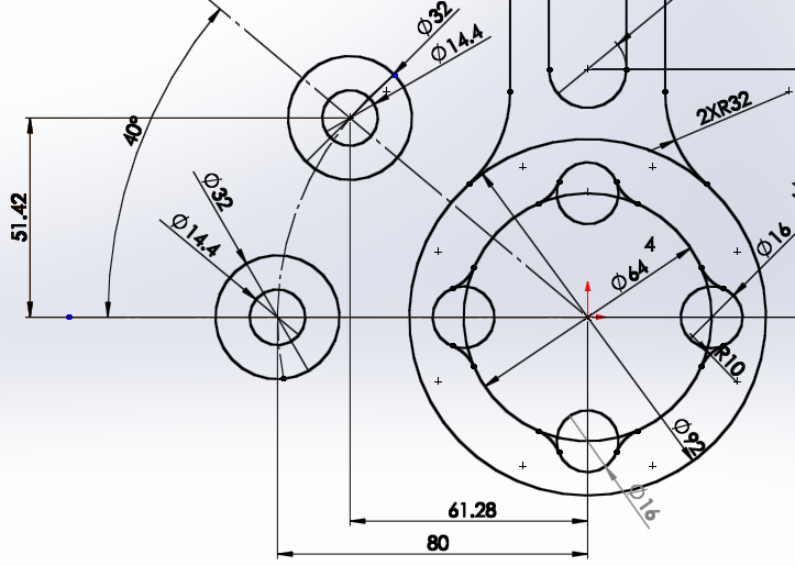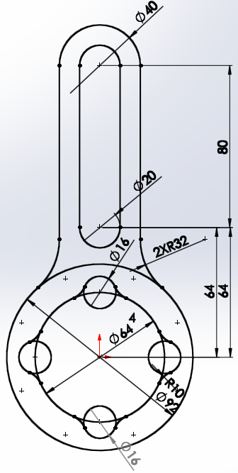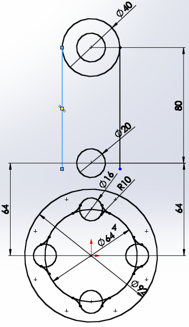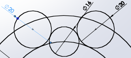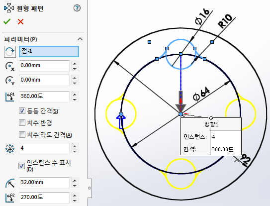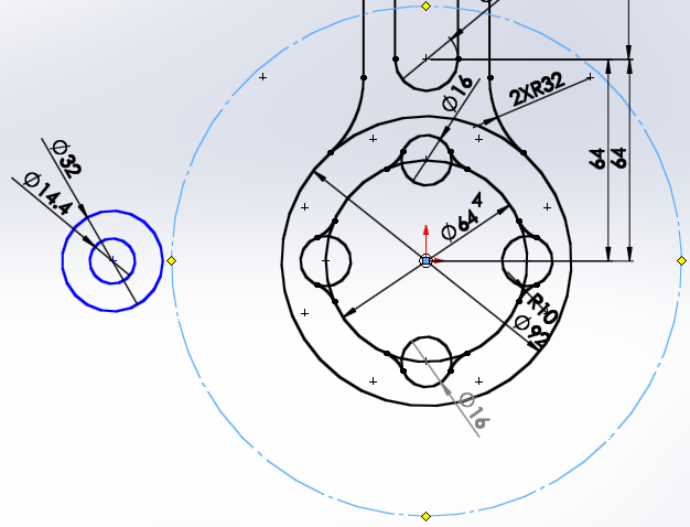 작은원(∅16)과 큰 원(∅64)의 원을 연결에서