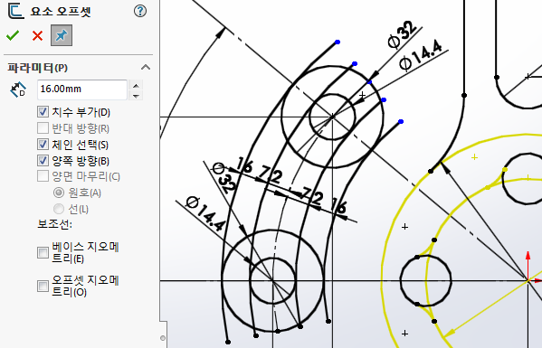 두 원 끼리 만나는 보조선을 '요소 오프셋'으로 연결한다.