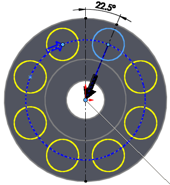 원을 원형패턴을 22.5도 갯수는 2개로 한다.