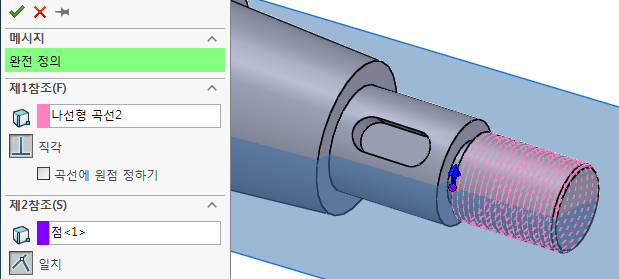 '참조형상-기준면' 클릭 - 방금 그린 나사선 클릭 - 나선의 끝점 클릭을 하면 기준면이 생성된다.