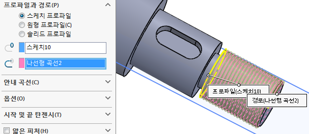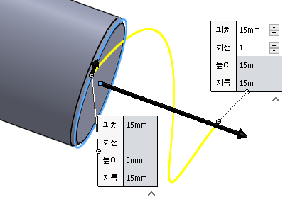 나사선의 첫 시작이 되는 부분의 원을 선택해야 한다.
