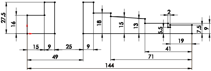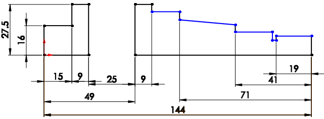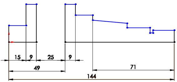 치수 작업은 가장 긴 부분(144mm)과 중간(49, 71mm)부분을 기입하고