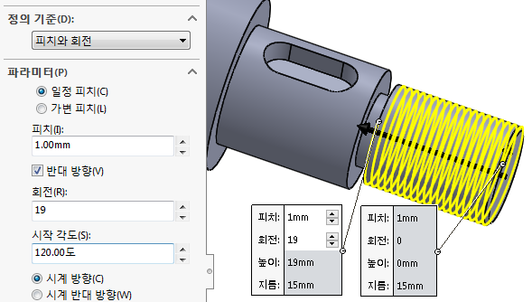 회전은 나사선이 위치할 정도로 임의대로 주었다.
