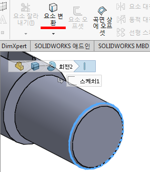 지금 스케치 형상은 원통의 중앙에 자리하고 있다.