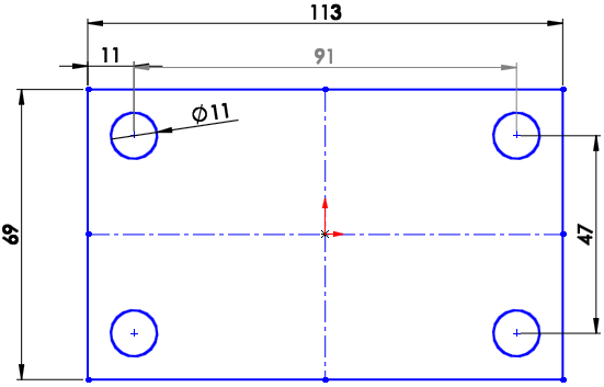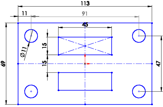 상단에 좌우가 대칭 치수이므로 중심 사각형으로 스케치한다.