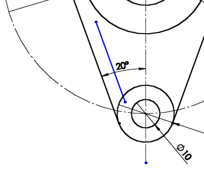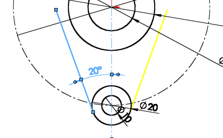 하단의 원과 중앙 수직선에 20도 각도를 이루는 선을 그리기 위해