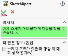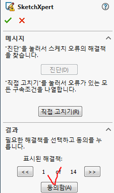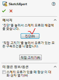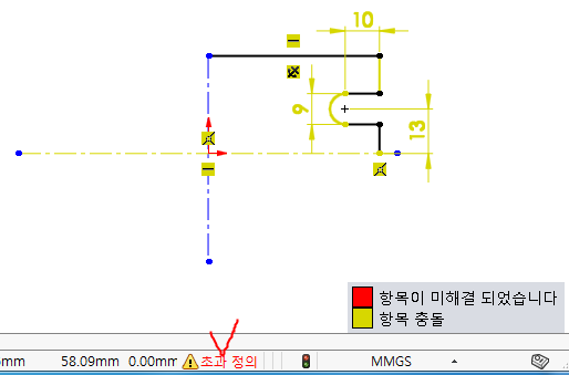 '초과 정의'를 눌러서 오류해결에 대한 솔리드웍스의 도움을 받으면 된다.
