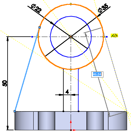 바닥 형상과 원에 tan 구속조건으로 선을 긋는다.
