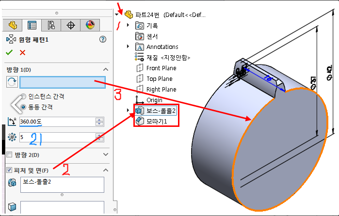 디자인 트리에 있는 '보스-돌출2'를 선택하고 방향은 원을 클릭한다.