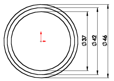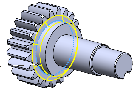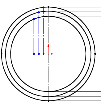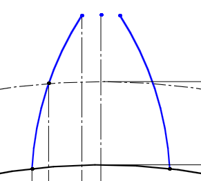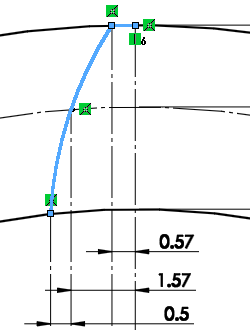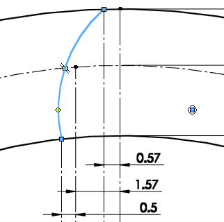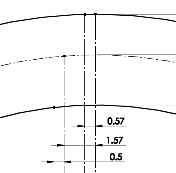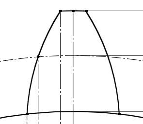 모듈 : 2 , 잇수 18 제일 왼쪽부터 첫번째와 두번째 선의 간격 : 모듈/4 = 0.5 두번째와 세번째 선의 간격 : 2/모듈 = 1 두번째와 네번째 선의 간격 : 1.57 3점호로 양끝을 연결한다. 중간점은 호와 점의 �
