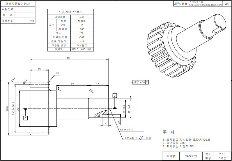 생산자동화 기능사 - 기어가 포함된 축모델링하기 (cad study-솔리드웍스 )