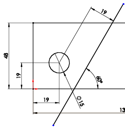원 옆에 19만큼 떨어진 곳에 선을 긋는다. 각도 60도로 한다.