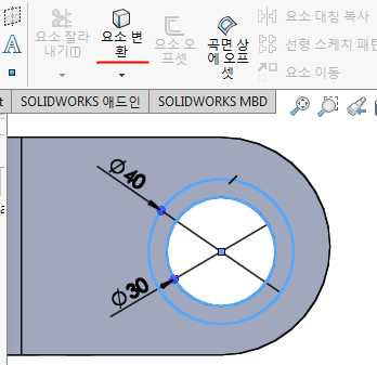 보이는 두 원을 잡고 요소변환을 누른다.