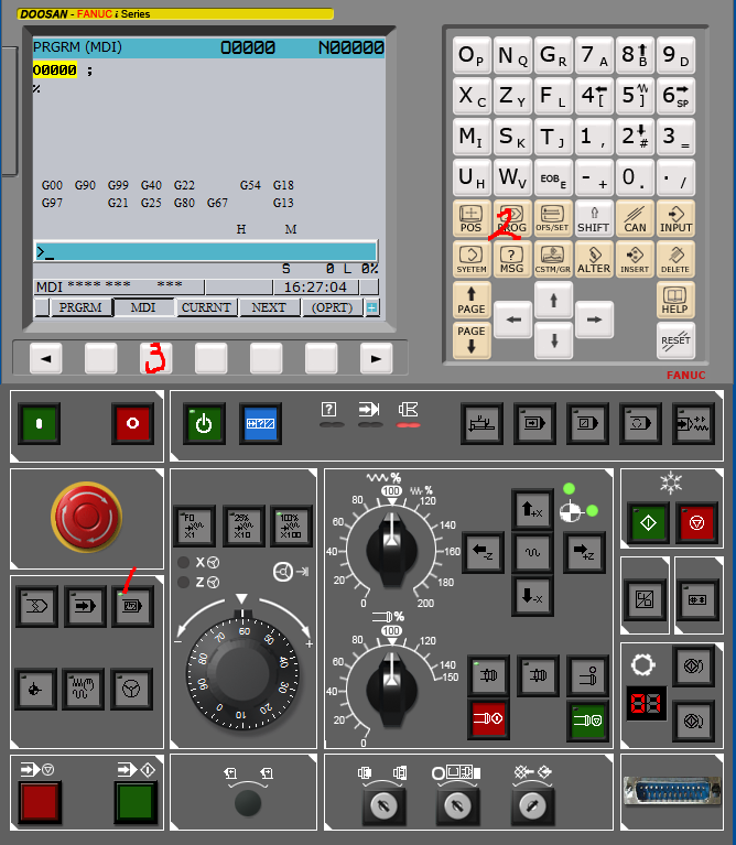 터치 패널에서 G97 S1000 M03를 입력 - EOB 클릭 - INSERT 클릭하면