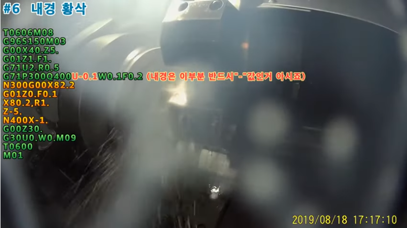 G00X60.Z5.T0101M08 (진입점 보정하면서.. 절삭하며 들어간다. 절삭유도 넣는다.) (G00X60.Z5 시작위치까지 가라)