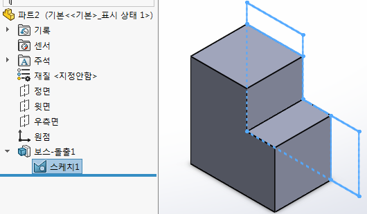디자인 트리의 '보스돌출-스케치'에서 마우스 우클릭-보이기를 눌러