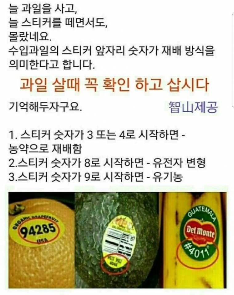 수입 과일 스티커에 8로 시작하는 숫자가 있다면 PLU 코드를 관리하는 국제표준기구 IFPS에서 유전자 변형 농산물 분류용으로 83,000~84,999번의 PLU 코드를 할당했지만 한 번도 사용된 적 없어서 83,000은 일반 재배 농산물, 84,000은 유기농 재배 농산물에 쓰일 예정이에요.