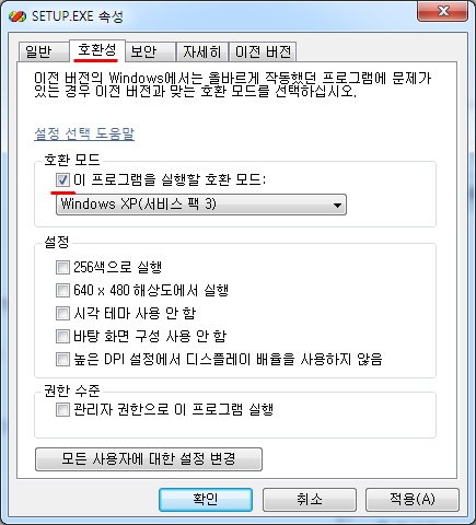 폴더 안의 SETUP.EXE 파일을 마우스 우클릭 - 속성을 들어간다.