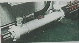 팬이 달린 모양의 냉각기와 긴 파이프의 양쪽을 플랜지로 막고 위쪽으로 두 개의 관을 연결한 부품을 보여준다. 플랜지 커버를 열면 가는 파이프가 많다. 팬 달린건 공랭식 원통은 수냉식)