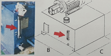 22. 유압파워 유니트에서 화살표가 지시하는 B부품의 명칭과 용도를 쓰시오.