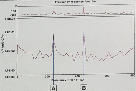 53. 고유진동수 측정시 그래프에서 표시되고 있는 A,B가 나타내는 의미를 구체적으로 기술하시오. (검은 화면에 높은 주파수가 2개 있다)