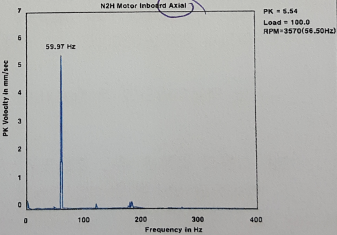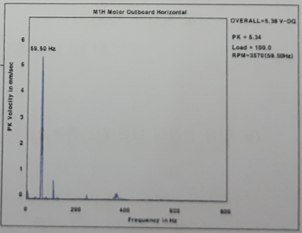 57. 화면은 모터 축방향에서 측정한 진동 스펙트럼을 보여주고 있다. 이 설비에서 발생하고 있는 결함 원인을 기술하고 대책을 세우시오.