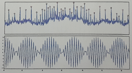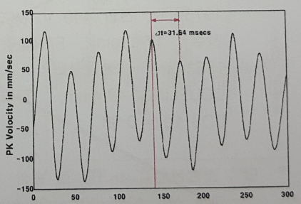 51. MOTOR의 수직 방향에서 측정한 진동의 시간 파형이다. 진동의 주기는 MOTOR의 회전주기와 일치하고 있다. 이모터의 회전수를 구하시오 (그래프에 파장을 Δt=31.64μm로 표시