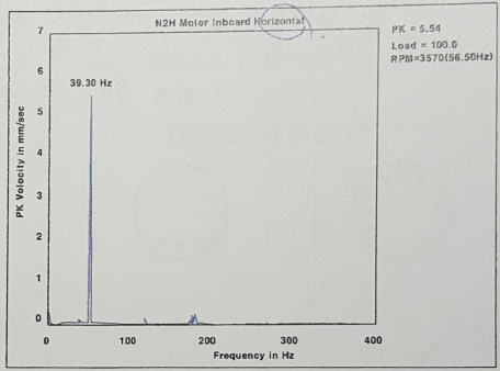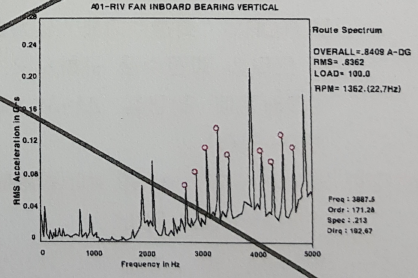 54. FAN부하 측에서 측정한 진동 값을 보여주고 있다. 이 설비에서 발생하고 있는 결함원인을 기술하고, 결함 주파수를 계산하시오.