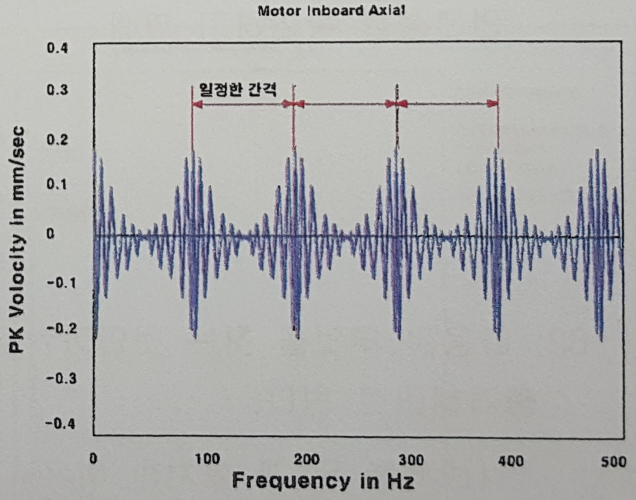 67. 모터측에서 측정한 소음 주파수이다. 이 설비에서 발생하고 있는 결함을 기술하시오.