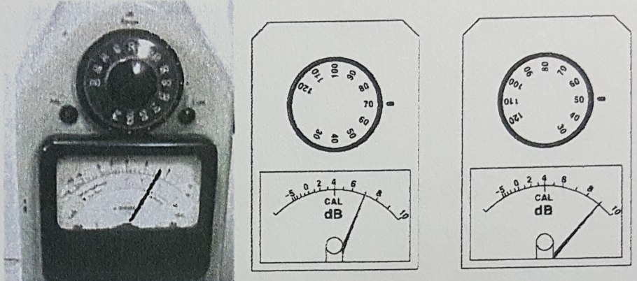 (소음측정기 측정값을 보여준다. 다이얼은 50을 가르키고 회전하는 바늘은 8과 10 사이를 가르킨다. 50+9=59dB 또 다른 값은 70+7 = 77dB