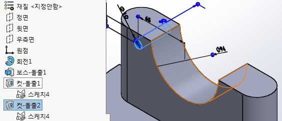 직선홈의 윗 선과 반원의 수평선을 '동일선상' 구속조건을 부여하여 붙여 준다.
