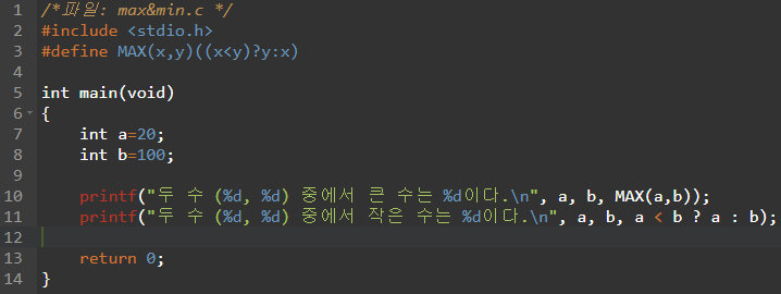 printf("두 수 (%d, %d) 중에서 작은 수는 %d이다.\n", a, b, a < b ? a : b);
