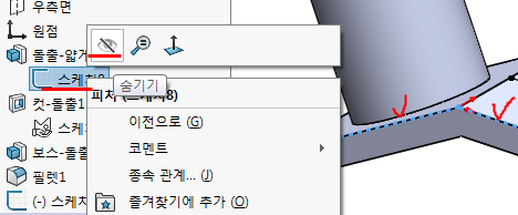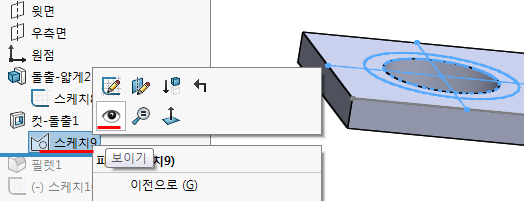 돌출컷과 돌출보스 작업이 끝나면 '보이기'를 했던 스케치는 '숨기기' 해준다.