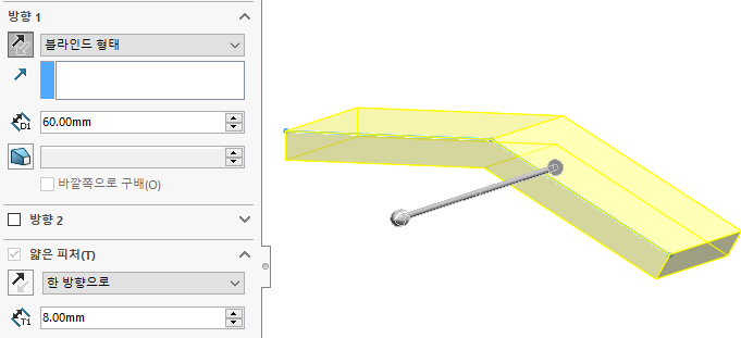이때 방향1과 얇은 피처(이미 체크되어 있음)를 이용한다.