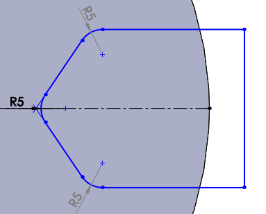 보조선 끝에 지름 6mm인 원을 스케치하고 관통을 시켜준다.