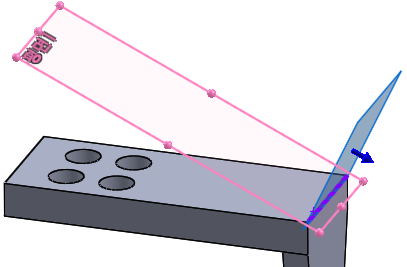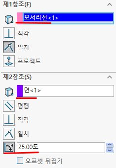 '참조형상-기준면'클릭, 모서리선 클릭, 윗면 클릭, 각도를 25도 준다.