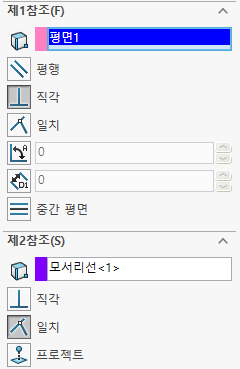 제1참조에는 '평면1'이 선택되어져 있다.(직각은 기본으로 되어 있는 듯 하다)