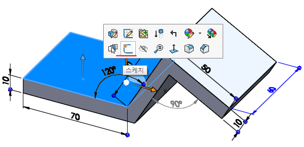 왼쪽 형상의 윗면을 선택하고 스케치 작업을 한다.
