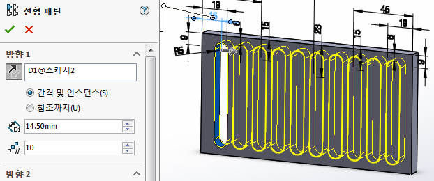 위 그림에서 처음에 장공형태의 구멍을 뚫고 패턴은 '선형패턴'으로 뜬다.