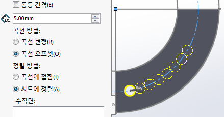 패턴 방향을 안쪽 원으로 잡고 '곡선 오프셋' 체크되어 있으면 아래 그림과 같다.