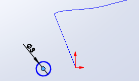 선의 끝점에 기준면을 만들고 지름 3mm의 원을 그려준다.