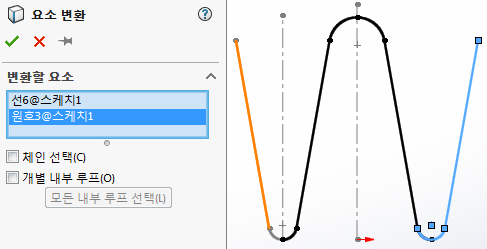 '요소변환'으로 생성된 스케치를 보면 필요없는 부분이 있다. (녹색 부분)