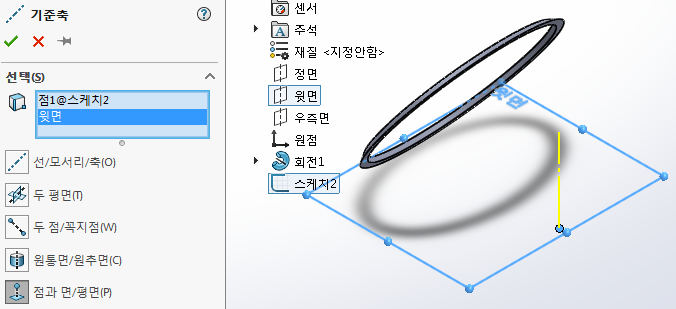 등각보기에서(현재 윗면) '참조형상-기준축' 클릭 - '점과 면/평면' 클릭 후