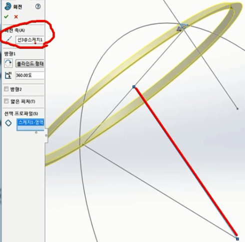 삼각형 스케치를 축 중심으로 회전시킨다.