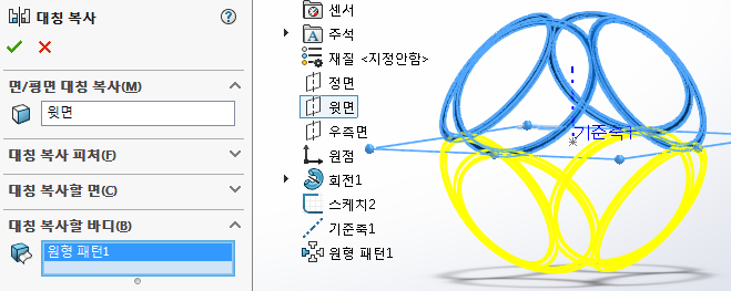 '원형패턴'을 선택하고 '기준축'과 '피처'를 선택한다.
