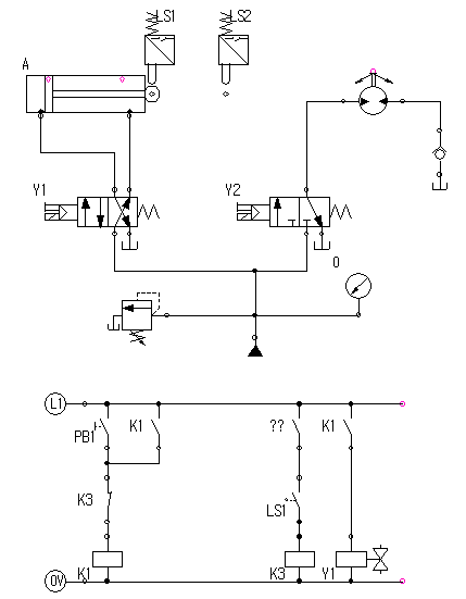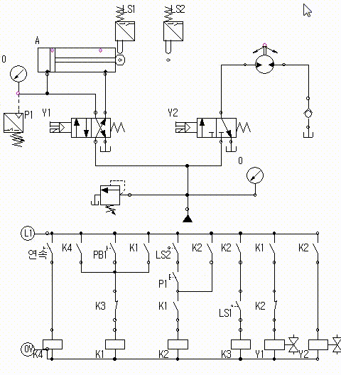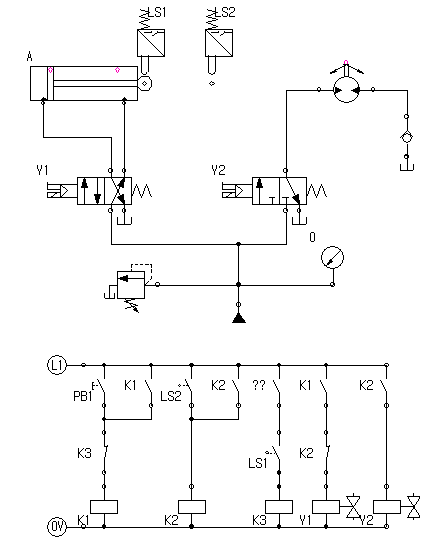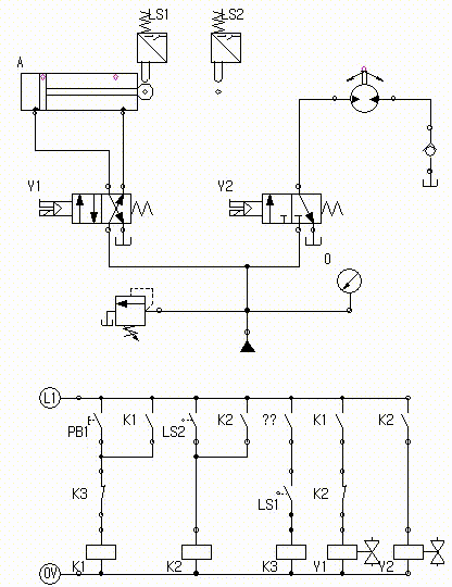 1) 초기상태에서 시작 스위치(PB1)를 ON-OFF하면 실린더 A가 전진하고 실린더 A가 전진완료 LS2 리밋 스위치가 동작되면 실린더 A의 후진과 함께 유압모터 B가 동시에 회전하고 실린더 A가 후진완료 되면 유압모터 B도 정지되어야 한다.