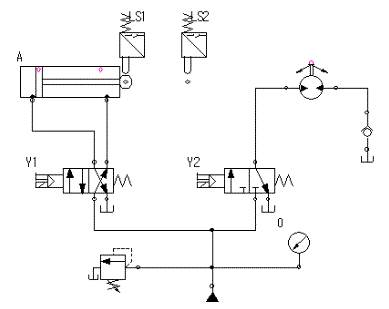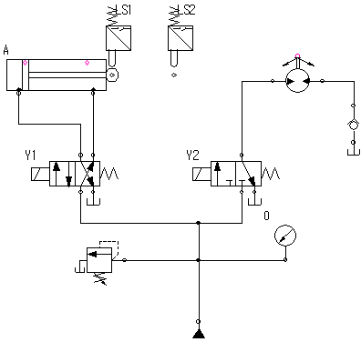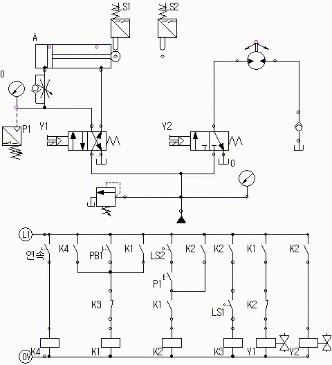 문제 : 실린더 A가 전진완료되어 LS2 리밋 스위치가 동작되면 실린더 A의 후진과 함께 유압모터 B가 동시에 회전