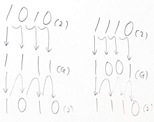 ◆ 위의 과정에서 얻은 2진수의 첫번째 비트와 그레이 코드의 두번째 비트의 합(carry는 버림)을 취하여 2진수의 두번째 비트로 정한다.